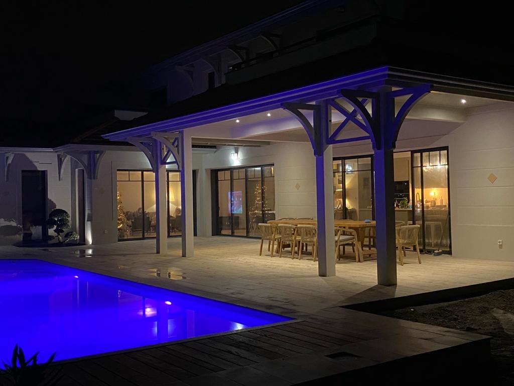 La villa est composée au rez-de-chaussée d’une très grande pièce à vivre de 80 m2 : grand salon avec bibliothèque, 2 canapés confortables, une télévision de 75 pouces et une grande table à manger, le tout décoré avec soin.