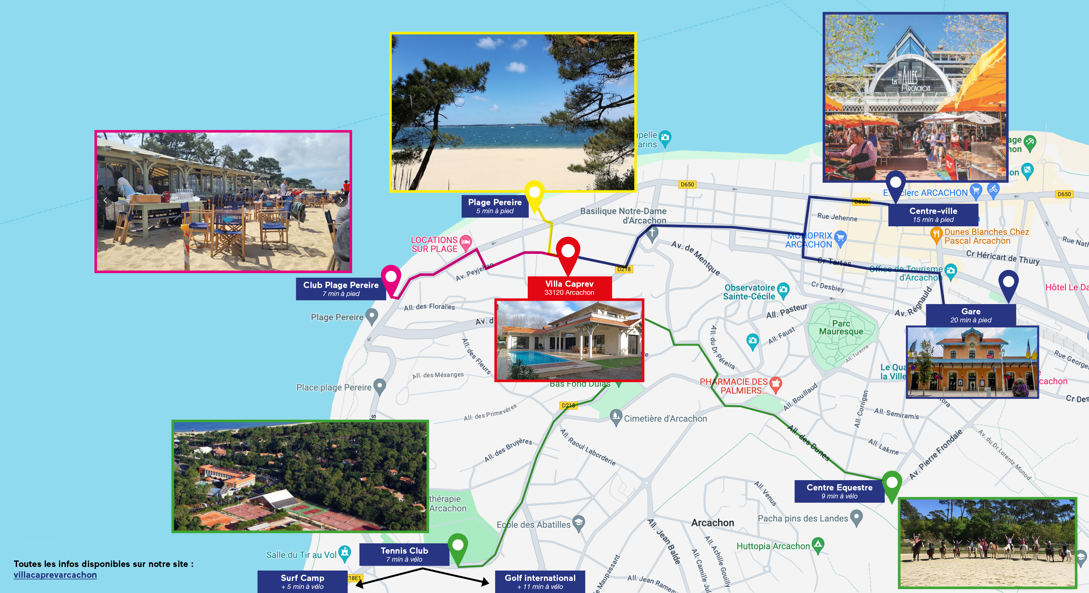 Située dans une allée tranquille, vous rejoignez la plus belle et la plus renommée plage d’Arcachon, la plage Pereire, en 5 minutes à pied. Vous êtes également à 5 minutes à pied d’une pharmacie et d’un commerce d’alimentation générale (Carrefour Market et Boucherie Chez Castaing). La piste cyclable proche de la maison vous mène en 5 minutes à vélo ou 15 minutes à pied au coeur du centre–ville animé, du Monoprix et de la place du marché d’Arcachon. Vous pouvez également rejoindre en vélo le Moulleau et la Dune du Pilat ainsi que les tennis clubs et ceux de voile et de surf.